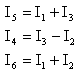 Rozpatrywany obwód ma k = 4 węzły i n = 6 gałęzi. Na podstawie I prawa Kirchhoffa układamy k-1 = 3 równania dla węzłów A, B, C: